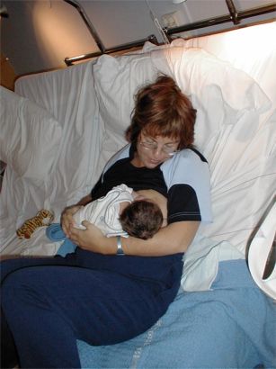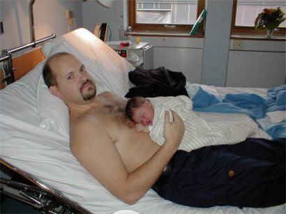 På morgonen den första dagen var det skönt att ligga på pappas mage.