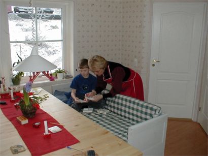 Här har julklapparna i sockan just öppnats. Mikael kollar intresserat.