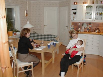 Monica, farmor och Rebecka diskuterar i köket.