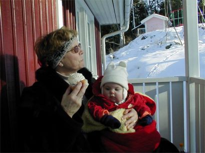 Farmor och Rebecka avnjuter en skön februarifika.