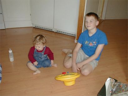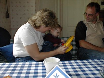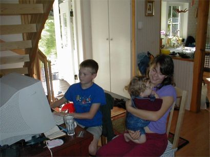 Kennet, faster Annika, Monica och farmor Siv står och spanar på de tre datorspelande barnen.